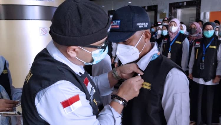 TIMES Buton/Kapuskes Haji Kemenkes Budi Sylvana saat menyematkan pin kepada petugas kesehatan haji. (FOTO: dok. Kemenkes)