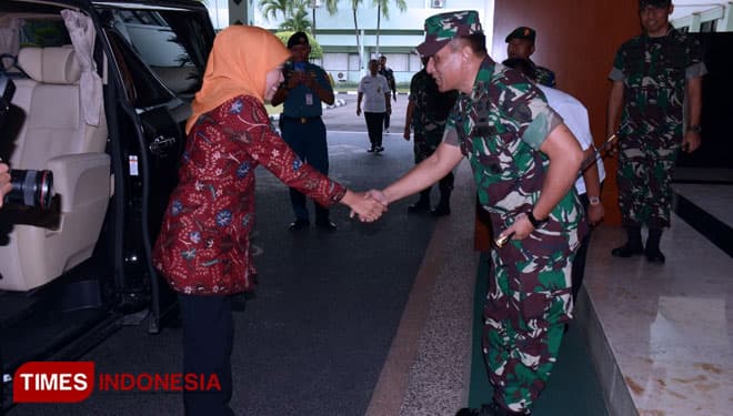 TIMES Buton/Pangdam V/Brawijaya, Mayjen TNI Wisnoe, P.B, menyambut kedatangan Gubernur Jatim, Khofifah Indar Parawansa di Makodam V/Brawijaya, Rabu (20/2/2019).(Foto: Istimewa)